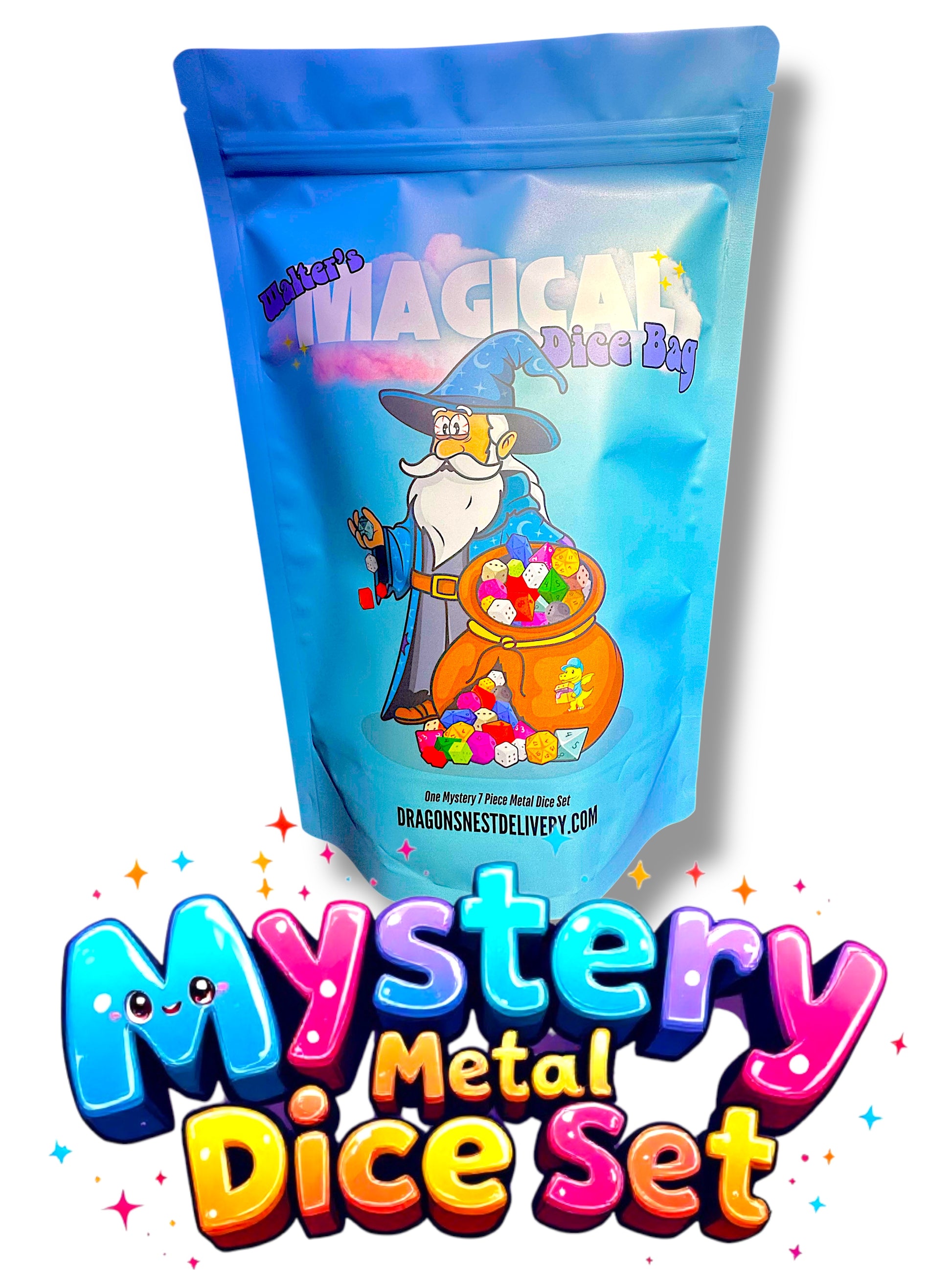 Bring out your inner "collecting" goblin with this Dungeons and Dragons Metal Polyhedral Bag. Included is a 7 piece metal polyhedral set for playing your favorite board game Dungeons and Dragons! Also included with the bag are 5 dungeons and dragons stickers.